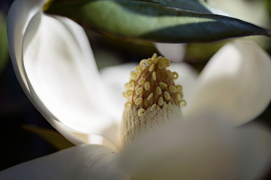 In May and June, visitors can stroll through the grove to see the sweet bay, Magnolia virginiana, and the southern magnolias, Magnolia grandiflora. The southern magnolia cultivar "Bracken’s Brown Beauty" is also in bloom and produces five-inch-wide, creamy white spring flowers.