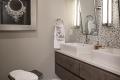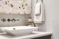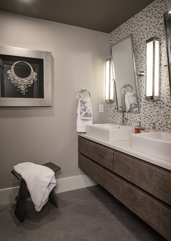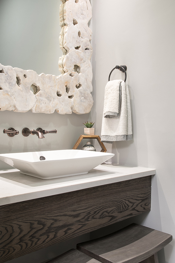 Similar creativity was applied to the laundry room, which had little functionality for the ranch’s new owners and was converted to a combination laundry/pool changing room with an adjacent powder room. Oversize porcelain tiles resembling organic concrete provide durable, water-resistant flooring. Karr Bick had installed the custom cabinetry for the remodeled kitchen and was called back to fabricate the laundry’s storage wall and Caesarstone-surfaced cabinetry. Pull-out trays under the raised washer/dryer add convenient work space, and massive wood display shelves from Reclaim Renew lend warmth and character to the multi-purpose room.