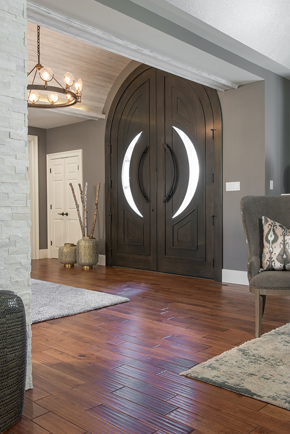 Now barrel-vaulted and LED-lighted, the foyer’s reclaimed antique tongue-and-groove ceiling is reminiscent of the kitchen ceiling and appointed with a forged-iron, gaslight lens chandelier from Restoration Hardware. Filling the arch is a magnificent 12-foot, rift-sawn white oak entry door, fabricated by The Scobis Company from Keller’s Asian-inspired design. To update the staircase, the original balustrade was replaced with a stylish custom treatment by Classic Metal Craft.