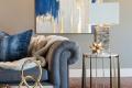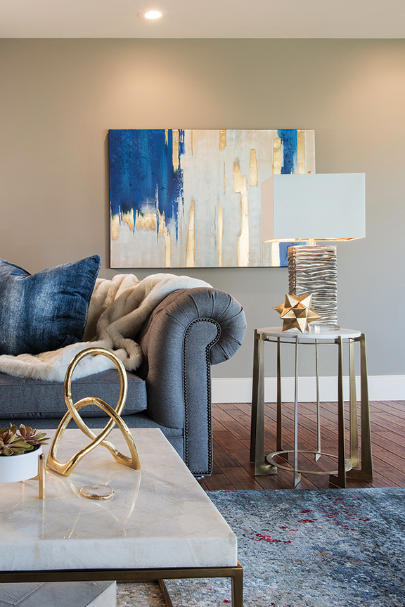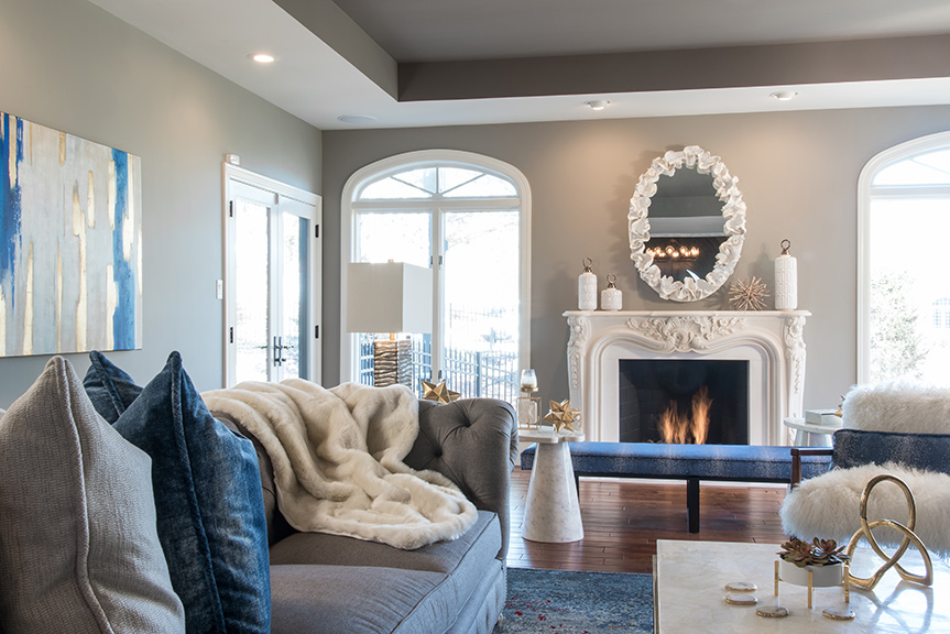 Taken down to its “bare bones,” the tray-ceilinged living room was stripped of decorative architectural onlays and moldings. The ornate fireplace, however, was retained and became the basis for the room’s new Mid-Century décor, accentuated by a unique “ruffled” mirror above the mantel. Soft blue and gray furnishings, marble cocktail and end tables from Curated Kravet, and a basket weave entertainment center and contoured marble accent table from Global Views create a fresh, youthful ambience. And for a comfy “pop of wow,” Kris added furry white chairs from Arhaus.