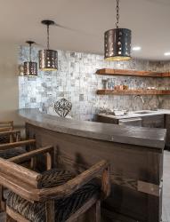 The ultimate man cave, the spacious lower-level entertainment area is fully “tricked out,” per the husband’s instructions. He selected the pool table, but the rest was left to Kris, who decided to transform the space into an “explosion of the dining room elements.” Reclaimed wood in a herringbone pattern blankets the ceiling. A curved soffit adds visual interest, and the curve is repeated in the flooring, partially tiled in porcelain with the remainder in an engineered version of the hickory planks upstairs.