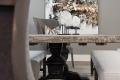 The designer’s innovative styling is particularly evident in the dining room, where the coffered ceiling is topped with reclaimed lumber installed in a herringbone pattern, and the coffer’s side walls are lined in shimmery mica wallpaper. Inset with soapstone, the aged-wood trestle table is set on a textured damask rug and bracketed by exposed-back host chairs upholstered in velvet, all from Arhaus.