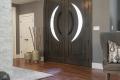 The serving area is furnished with rustic Karr Bick cabinetry, and the emphasis on curved contours is repeated in the crescent-shaped island bar. Created by TruCrete, the bar is surfaced in weathered concrete and cleverly embedded with LED lighting. Overhead, perforated metal pendant lights replicate the star-like effect.