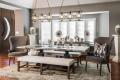 Two lantern-style Currey & Company lighting fixtures span the table and, responding to her clients’ request for a less formal dining space, Kris chose banquettes from Noir in Los Angeles as an alternative to dining chairs. Also hand-crafted by Noir, the buffet features aged mirror doors trimmed in metal, and an arrangement of decorative geodes lining the table subtly repeats the coffer’s sparkle.