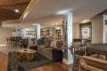 Shimmering white stone covers the predominant wall, which showcases display niches for the owner’s sports memorabilia. Pewter-metallic cork wallcovering wraps the support columns, reflecting the metallic Anne Sacks wall tiles behind the fully equipped wet bar. Ruggedly masculine, a petrified wood coffee table is positioned in front of a comfortable lounge from Erdos. The lounge faces a media console and backs to a curved, 15-foot floating walnut bar top, sourced from Freedom Products. Set on stainless legs rather than a heavy knee wall, the expansive bar top allows for considerable beverage/conversation seating, while preserving the room’s sense of openness.