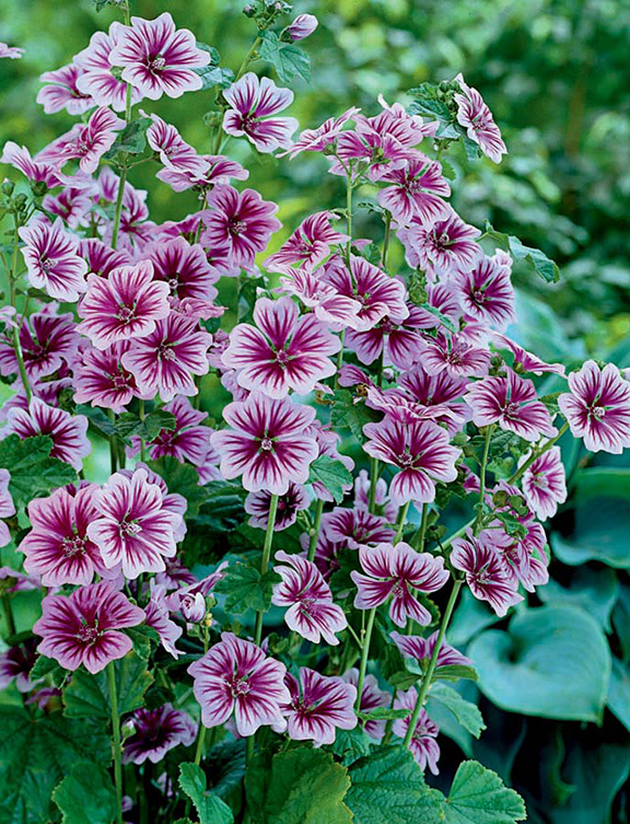 3. "The sun-loving Malva sylbestris 'Zebrina' will dazzle you with satiny lavender and maroon striped blooms from July through September. They are great for cut flowers and are known to attract butterflies and humming birds.” Sarah Riley, Bowood Farms.