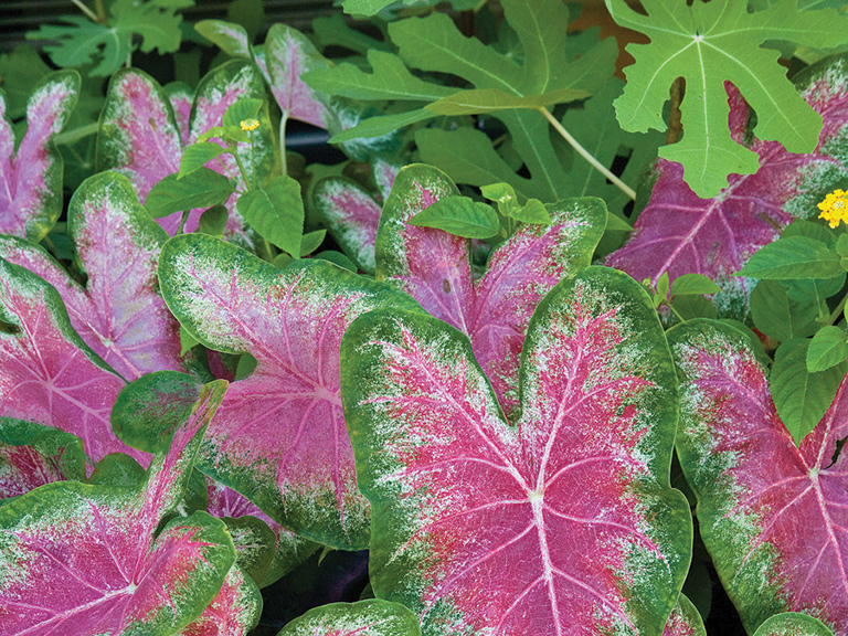 5. “The bright leaves of Caladiums have various shapes, like hearts or arrows and come in color combinations of red, pink, rose, white, chartreuse and green. These easy plants provide easy color any gardener will love. ” Richard Poynter, Poynter Landscape & Architecture.