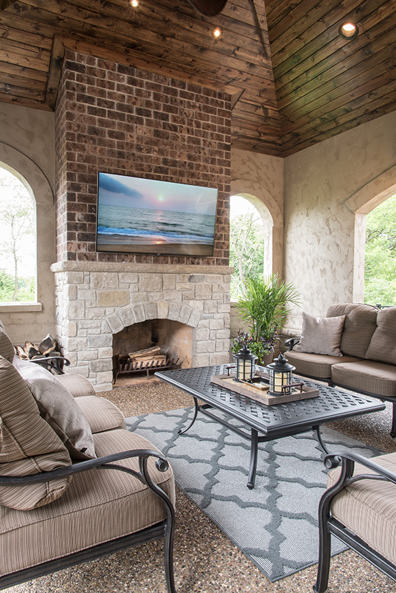 Describing the transition from indoors to outdoors, Kemp explains, “I wanted to create an intimate outdoor space, without interrupting the flow of the plan.” Double-vaulted, the open-air living room has a superbly crafted, distressed knotty pine ceiling, exposed aggregate flooring, a full-height brick-and-stone wood-burning fireplace, 65-inch flatscreen TV and a True kegerator for handy beverage service.