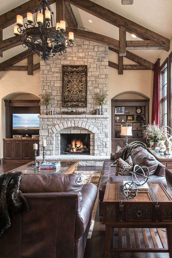 Dominating the main level, the grand salon is a dramatic entertainment space, with 18-foot ceilings, distressed arched beams and a floor-to-ceiling Missouri limestone fireplace. To one side, the ceiling drops to 10 feet, creating a convivial atmosphere for the bar area, which is delineated by a bi-level peninsula and features sueded granite countertops and provincial Beck/Allen cabinetry.