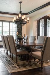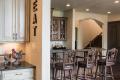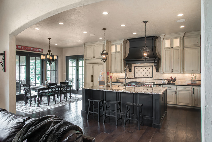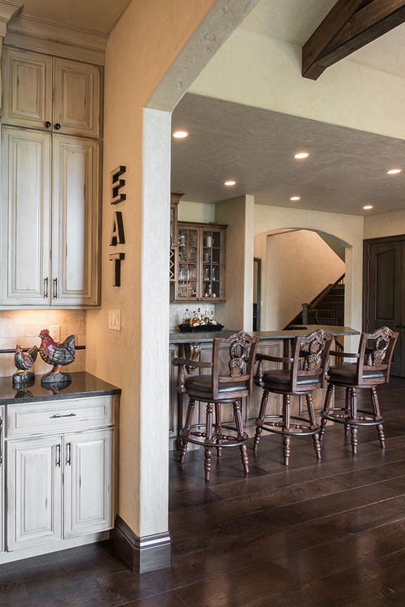 The foyer immediately reinforces the theme, with an arched entry door in glass and wrought iron and a groin vault that soars to 16 feet. Although most of the home is more relaxed and rustic, the study and dining room flanking the foyer retain a sense of formality. Rich wainscoting lines the study walls, and the ceiling beams are smooth, rather than distressed. An octagonal tray ceiling with 7-inch molding tops the dining room, and the adjacent butler’s pantry is barrel-arched.