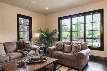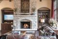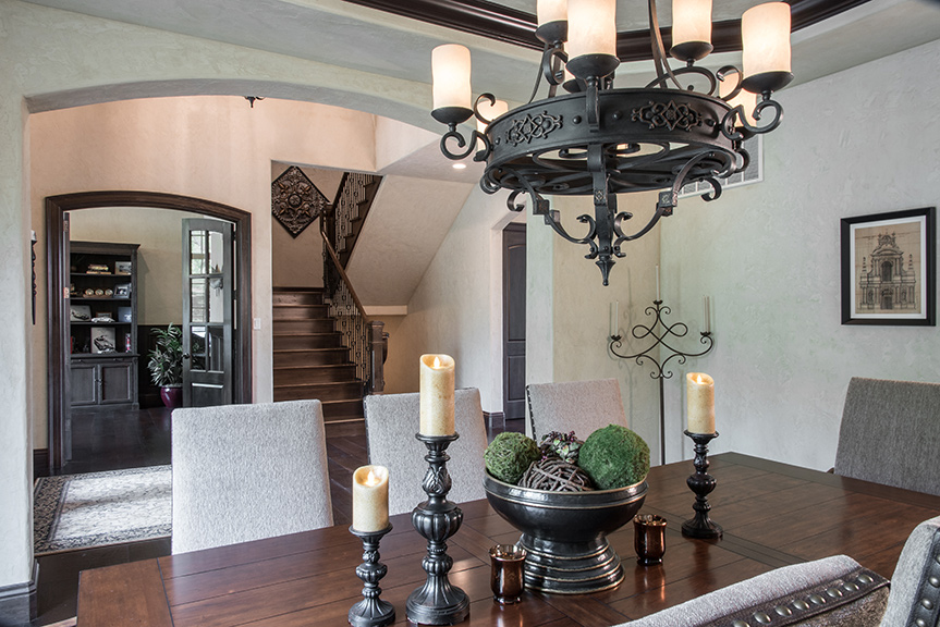 Fully consistent from the exterior to the interior, the architectural features visually emphasize the plan’s flow. The elevation is a sophisticated blend of stone and stucco, with bronze trim, simulated slate shingles, arched dormers with copper roofs and a porte-cochère leading to the detached four-car garage. Inside, these classic Old World elements are repeated with Venetian plaster walls, arched openings, full masonry fireplaces, wrought-iron lighting fixtures and dark-stained millwork, distressed beams, and wide-plank distressed oak flooring.