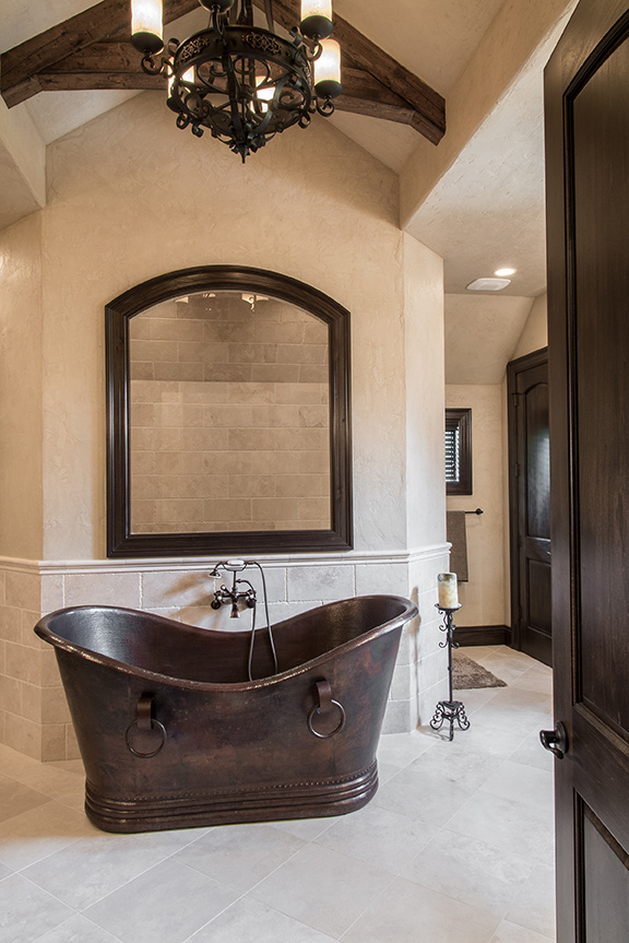 Lavished with travertine and also designed by Kemp, the master bath is literally breathtaking. “There’s a lot of geometry going on in this space,” he says, indicating the peaked ceiling, distressed trusses and freestanding custom copper tub that backs to a room-size shower, with 10-foot seat, six body sprays, and two shower heads. Even more imaginative, controls just outside the enclosure convert it to a steam shower.