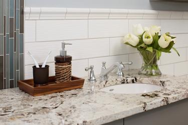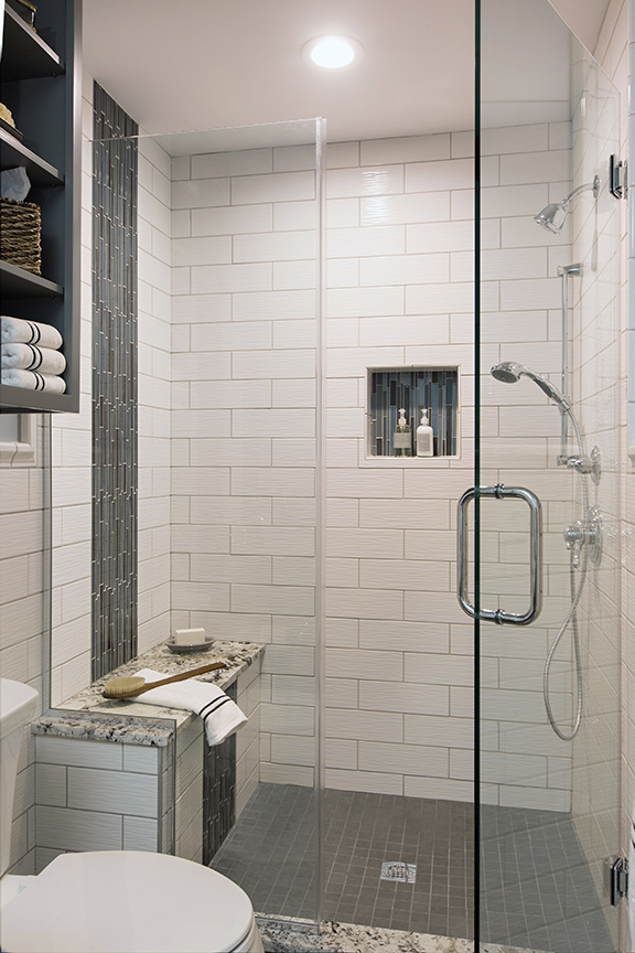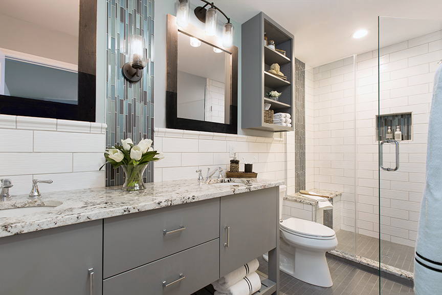 Designed for her client’s two elementary-school-aged boys, this 60-square-foot bathroom by Joni Spear Interior Design needed to be masculine enough to take the boys well into their teenage years while having a modern, farmhouse feel. An unused closet was eliminated allowing the designer to include a double vanity so each child would have his own sink. The space is predominately covered with white tile in a larger size with dimensional waves to get away from the standard white subway tile. In the vanity area, a gray-and-brown granite countertop was chosen to hide dirt and spills the boys may incur.