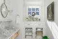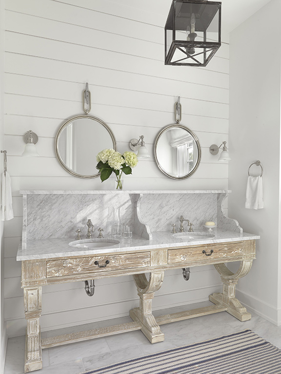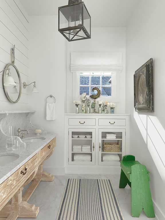 To achieve the casual, thrown-together look, smaller round mirrors and simple sconces mix with the larger, taller washstand. The coastal ambience is brought to life with the use of shiplap, round port-hole-like mirrors and a navy-and-white ticking stripe dhurrie rug. Other charming accents include a vintage green stool, collection of glass bottles with shells as toppers and, as with any true classic Nantucket space, a lantern hung from the ceiling to softly light the space.
