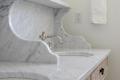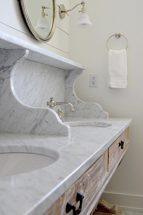 Coastal charm combined with plenty of space for guests was the request for this 166-square-foot guest bath designed by Amy Studebaker Design. A sofa table found during a buying trip down south inspired the bathroom’s overall design. Wanting to use a piece of furniture for the vanity to bring warmth and interest to the space, the designer was inspired to create a custom vanity reminiscent of old washstands. A simple, elegant top portion features corbels and a shelf. For added storage for towels and guests’ items, the designer created a built-in cabinet with chicken-wire door fronts, which brings a causal element while also adding texture.