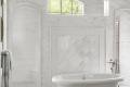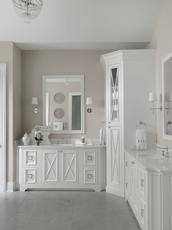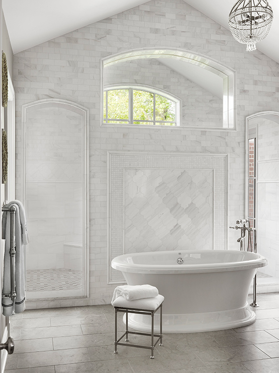 With a large, active family these homeowners sought a quiet oasis for their master suite. With ample room to create a luxurious retreat, designer Tamsin Design Group created the 400-square-foot clean and classic bath that would stand the test of time. The designer imparted custom detailing throughout with an original cabinet design and intricate tile work. The arabesque tile is a perfect backdrop to the floating soaking tub. For added comfort, a heated floor system was included with the honed limestone. Marble-like quartz countertops keep with the classic style the clients desired.