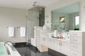 Why the judges love it: This bath is very spa like. We love the infinity illusion of the tub area. The space has an overall soft feeling despite the heavier hues of black and brown.