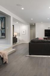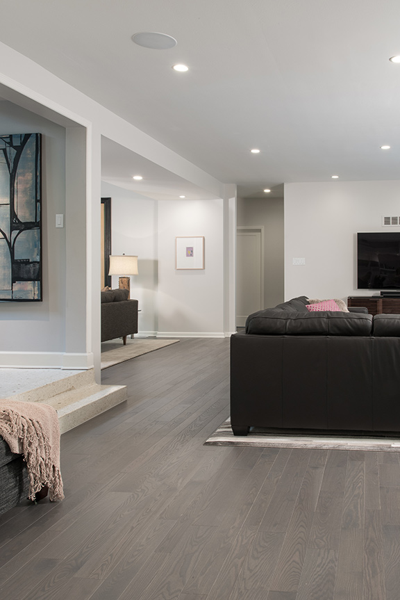 Outfitting such a pivotal room is no small undertaking. Satke-Niemeier’s secret? Start with the floor, she says. For a modern look that isn’t too slick, Satke-Niemeier began in the hearth room, opting for half-inch-thick oak wood flooring in a grey matte finish. “Typically we do a monolithic look with planks that are all one width. But here,” Satke-Niemeier says, “We used 3-, 4-, and 5-inch planks.” The result is a playful base that doesn’t take itself too seriously.