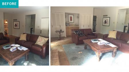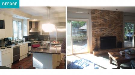 While there were plenty of doors and windows built into its original layout, this retro two-story house was always dark. When he was ready to revive his outdated kitchen, the homeowner initiated a major remodel by eliminating features that obstructed natural light: Old-school sliding patio doors – the kind with light-diffusing screens – were swapped for clear-panel French doors, and windows with between-the-glass blinds were replaced with sleeker double-hung models. The most impactful change, though, was the demolition of the wall and wet bar that partitioned off the kitchen and hearth.