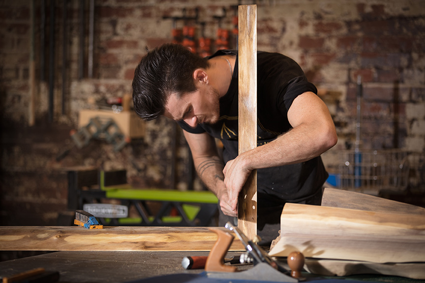 The “how” is a little more complicated, but can be wrapped in a bow with their RISE collection. This collection is full of modern designs and was specifically developed with trade skills in mind. In fact, Karleskint went directly to construction and trade companies to find out exactly the type of skills they were looking for and built the collection around that. He goes into detail saying, “The RISE collection is a product of creative problem-solving. It's simple and beautiful, but the production requires you to learn to cut, bend and weld steel and that's just on the legs. We go to the wood mill and select a tree, so the guys learn about arborism. They get to operate the wood mills, so they work heavy machinery. We slab the tree, we dry it, we work with inventory and packing. Plus after it's dried it has to be leveled and sanded and spray-finished. So, on these simple little end tables, there are more than 11 different jobs out there that hire for these skills.”