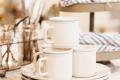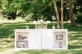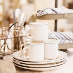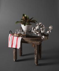 1. Stool from antique scaffolding, large wooden tray, red-and-white stripe napkin, set of three bottles, galvanized handle tray, magnolia leaf in white and cotton stems, available at Fleur De Chic.