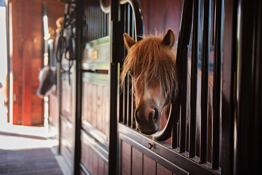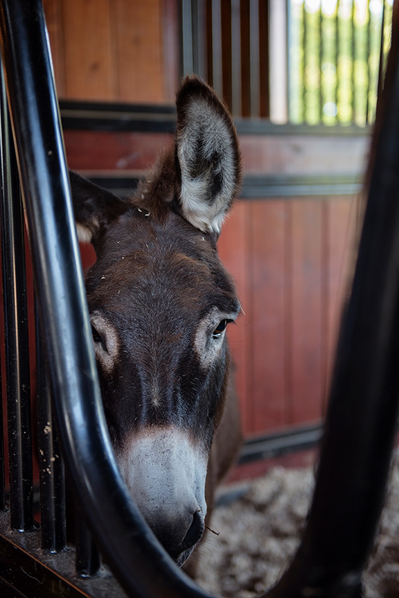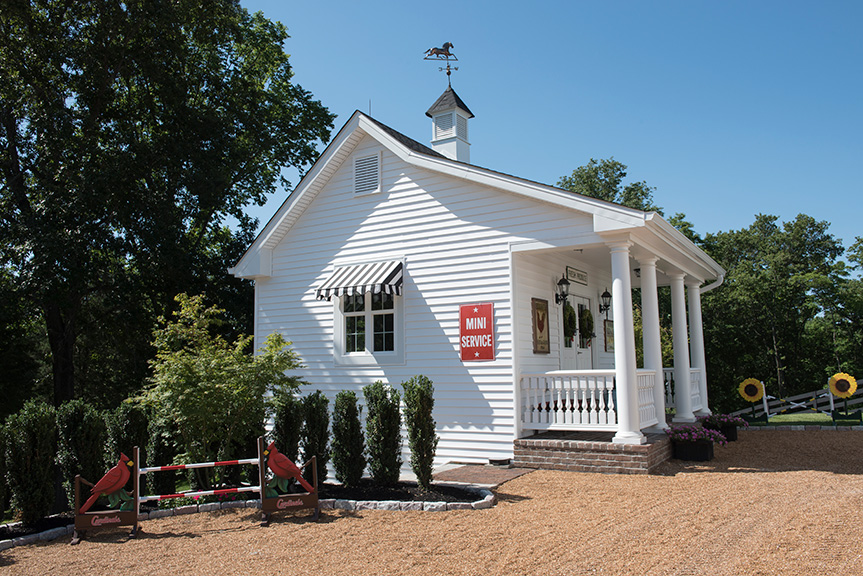 But there is much more to the expansive landscape than the house and pool. Veer to the right on the pea-gravel driveway just past the gates to the property and two classic, cupola-topped white buildings come into focus. Both are fronted with balustrade-lined verandas, and they are more important to the story of this special property than the house itself. Bearing a resemblance to buildings at the Kentucky Derby’s Churchill Downs, the larger structure is home to 15 rescue horses, 13 of which are mini horses. All live in gleaming, neat-as-a-pin, luxurious quarters rivaling those in which Anheuser Busch stables its pampered Clydesdales. The charming, smaller structure provides storage for the healthy grains and hay the horses enjoy.