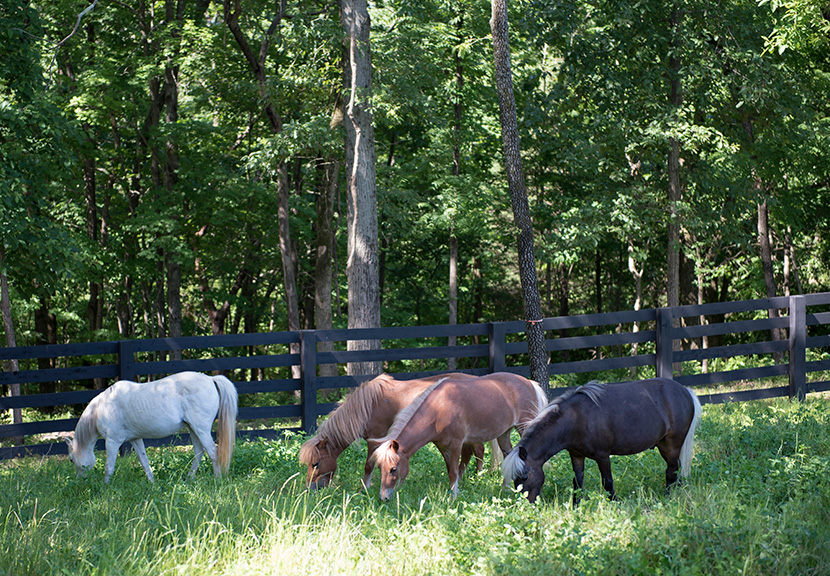 In 2013, rather than board their horses, the homeowner and her husband purchased enough land off Wild Horse Creek Road to accommodate their family of both people (including two sons in addition to their daughter) and animals. Two years ago they moved everyone into their current homes. “We had plenty of room in the barn, and my daughter suggested we get some miniature horses,” the homeowner recalls. (Mini horses by rough definition measure less than 34-38 inches in height as measured at the last hairs of the mane, found at the withers or highest part of the back.) “We got our first two and then things kind of snowballed.”