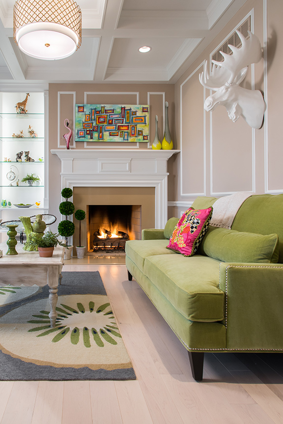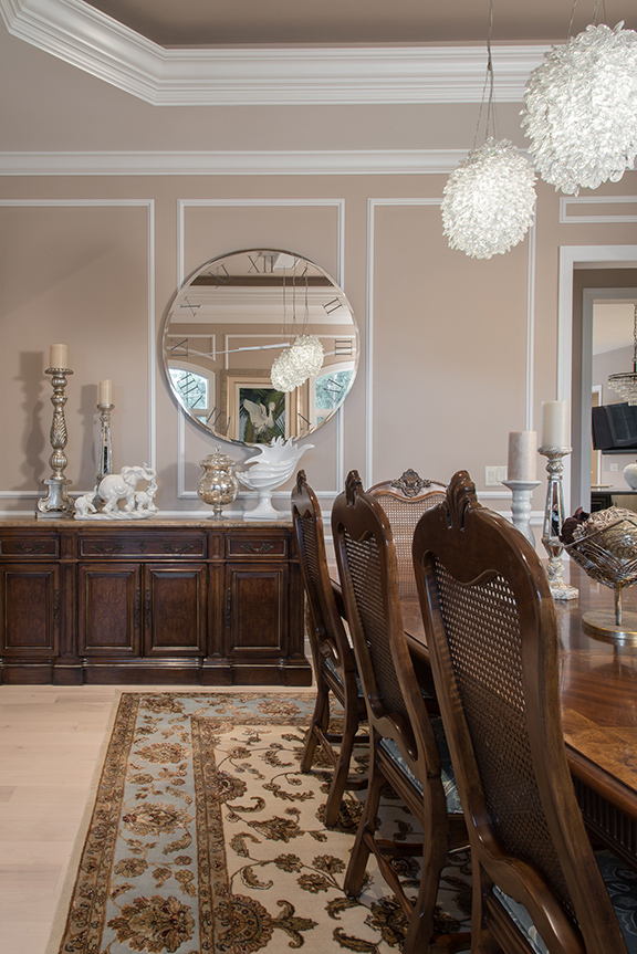 For example, the “cozy room” off the foyer is used primarily for TV viewing and mixes a vintage coffee table with a clean-lined, kiwi-green sofa, whimsically topped by a ceramic moose head. Glass shelves displaying memorabilia line the traditionally-styled gas fireplace, and above the mantel is a colorful abstract painting. Across the foyer, the dining room is highly formal, with their previously owned Drexel Heritage mahogany table, sideboard and gold-leafed chairs set on a classic floral/medallion rug. For a touch of “something unexpected,” she added contemporary crystal pendant lights and an oversize round mirror that’s actually a clock.