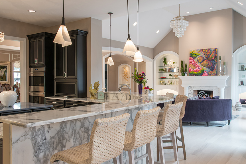 A U-shaped marble peninsula with farmhouse sink and overhang defines the spacious open kitchen, which is centered by an island topped in Azul Macaubus granite. Bold black cabinetry, subtly accented with pinstripes that match the maple flooring, complements the stainless appliances. For another “something unexpected,” the cabinets are fitted with glittering chrome-and-crystal hardware.