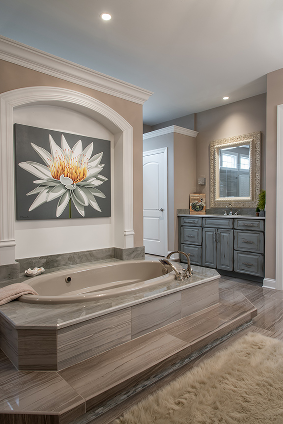 Far more serene, the deeply coffered master bedroom is done in soft earthen tones, and the see-through fireplace wall is faced in clear tiles with diamond dust grout. Custom bedding blankets the Ethan Allen bed; a custom bench provides a place for the dogs to snooze; and the window seat, upholstered in lime green, adds a pop of color. The lavish master bath showcases a dramatic, under-lit platform tub, encased in Sea Pearl granite and set against a free-standing wall that backs to a large glass-enclosed shower.