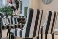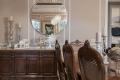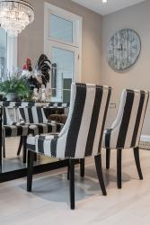 Extending from the kitchen, the breakfast area showcases a custom-made mirrored table, black-and-ivory striped chairs and bench seating, and a charming vintage wall clock.
