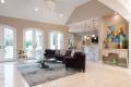 Family central, the great room overlooks an open-air deck and adjoins a three-season sunroom, thoroughly enjoyed by the resident birds. The great room soars to 17 feet and is dominated by a curved modern sectional, upholstered in a luscious aubergine. The circular Wyland coffee table is beveled glass supported by a bronze dolphin sculpture. Like most of the original artwork in the home, this piece was created by a Florida artist. And proving that “family” includes their beloved animals, padded niches were built on either side of Calcutta marble-fronted fireplace where the dogs can lounge in comfort.