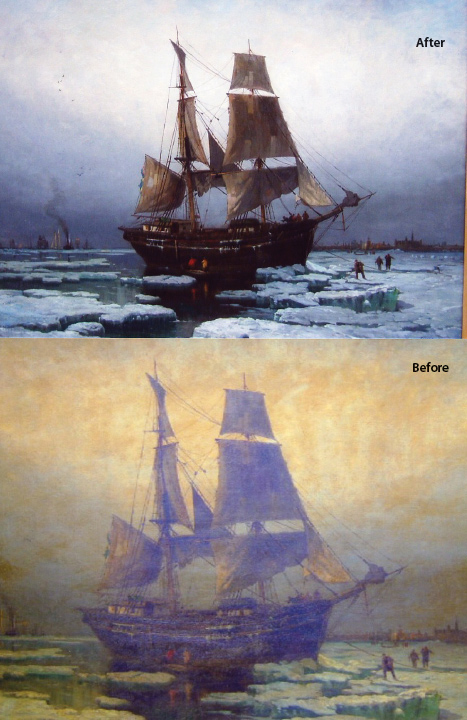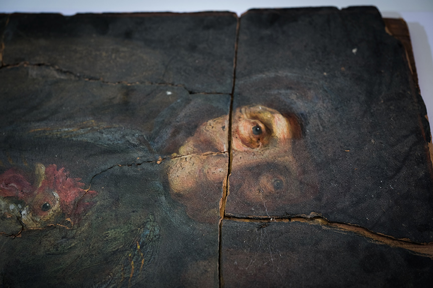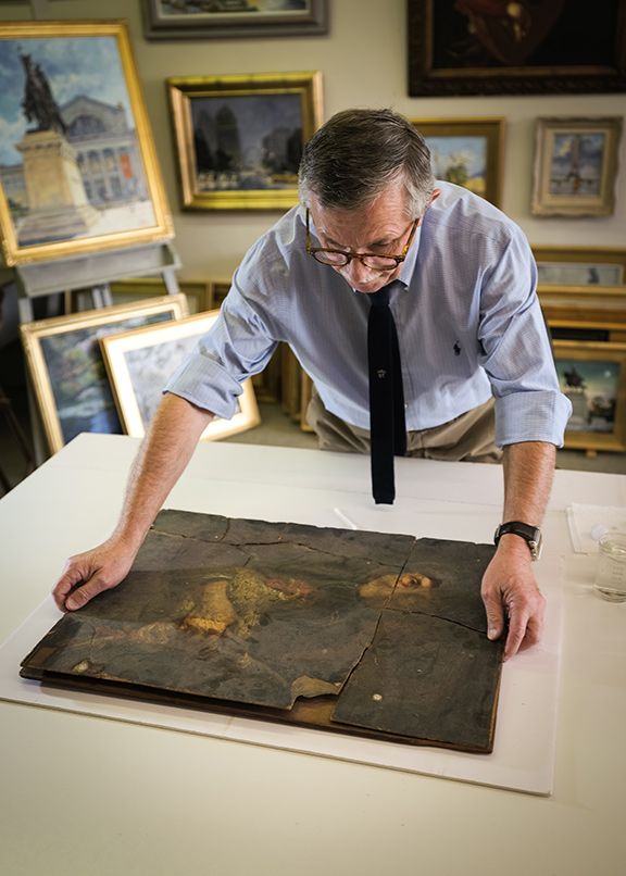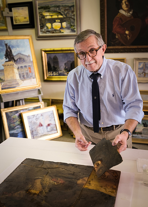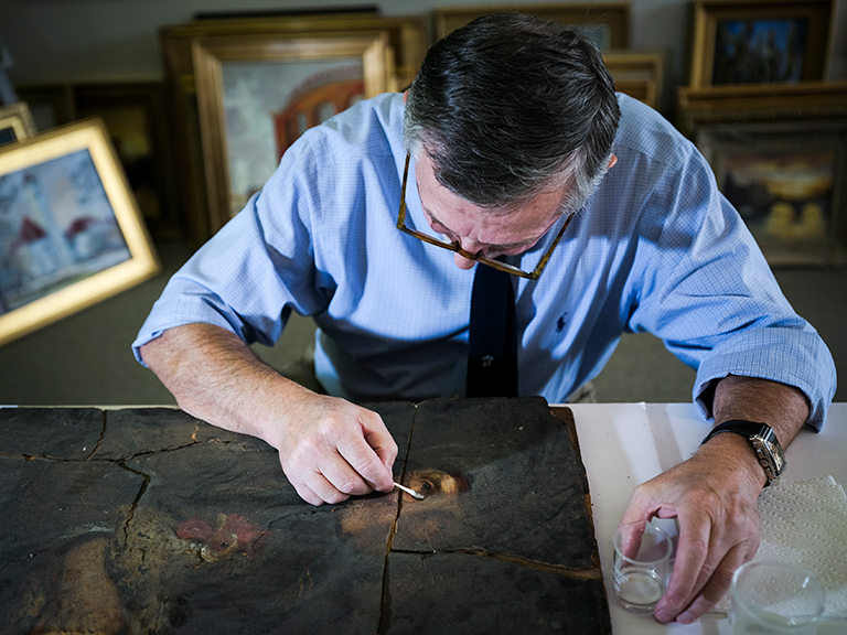 This combination of art skills and chemistry knowledge are invaluable to the restoration process. Parts of this process will vary from piece to piece, but Szelag always begins by carefully examining and documenting the front and back of the painting. Then he will run a series of tests to determine which types of solvents he can safely use for the cleaning, which removes dust and smoke. He will then remove the varnish layer.