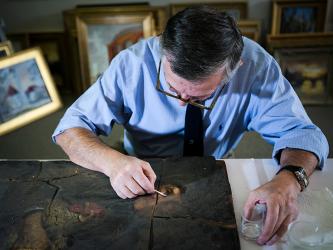 Next, Szelag will make any necessary repairs. This includes patching the painting, adding new varnish and doing any touch-ups to the paint layer. This is the tricky part because the oil paints today simply won't work. Due to this, Szelag must specially prepare his paints to match the color pigments of the piece. The final touch is to add a final layer of varnish and return it to its frame.