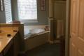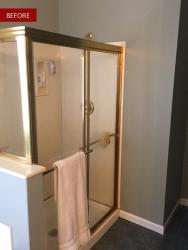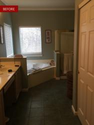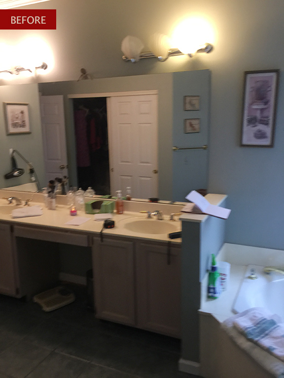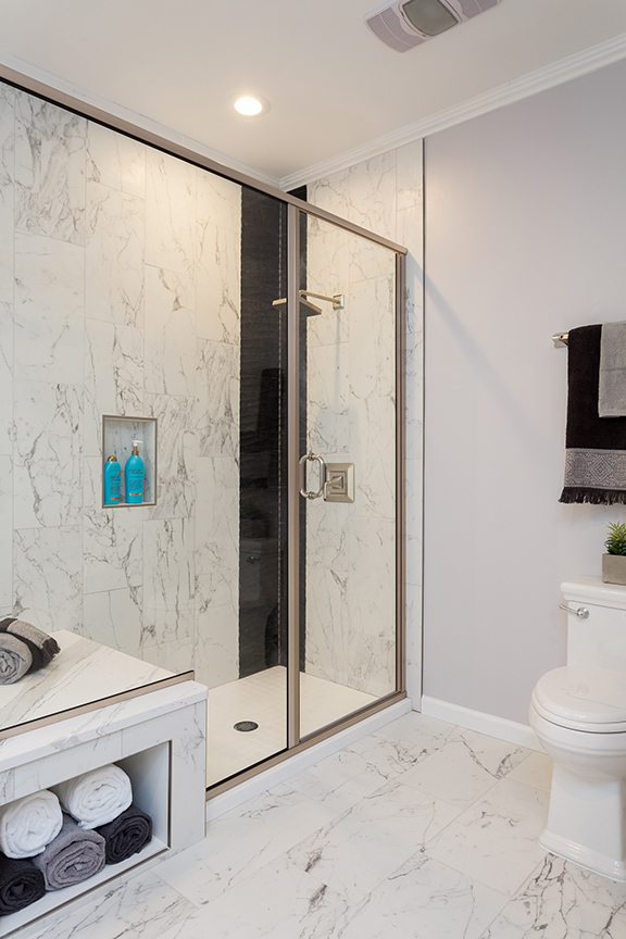 To achieve the “light and bright” look Dawn desired, Candice installed strategically placed can lighting throughout the room. In addition to a physically larger room, a glass shower lends the space more visual openness.