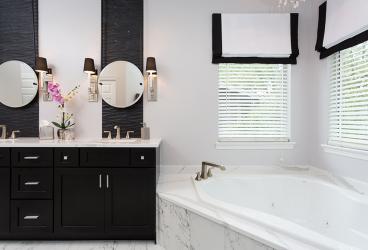 Dawn had already purchased a black vanity that caught her eye, so when Candice Wideman of Youtopia Designs took up the project, the design came together around that starting point. "I liked that she wasn't afraid of blacks and whites," says Candice. “She also wanted something that was somewhat feminine with some masculine qualities.”