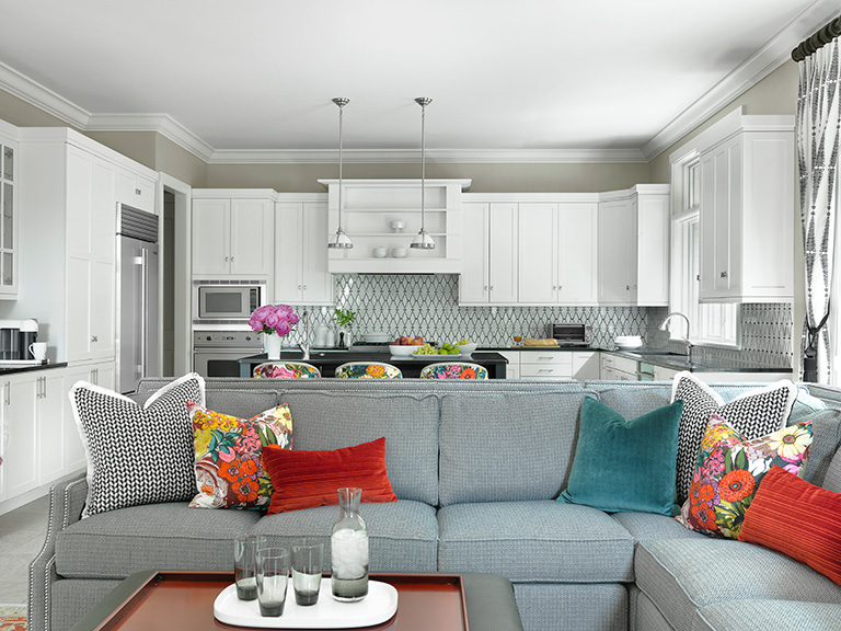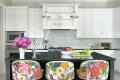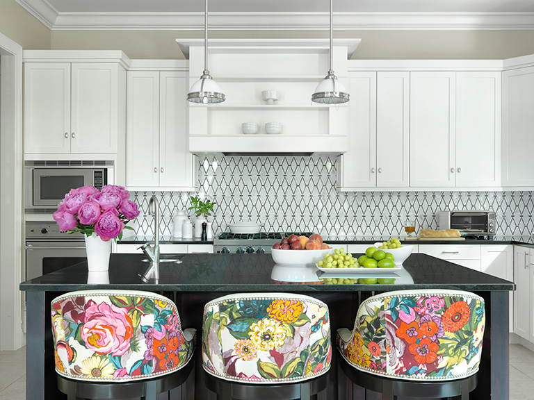 Castle Design completely transformed this kitchen into a bright and colorful space with newly painted cabinets, new backsplash tile, colorful fabrics and coordinating window treatments. The homeowner is from Louisiana, so adding a New Orleans flair to the space was a must. The designer was inspired by the colorful and modern print of Vervain Secret Garden fabric. Counter stools were upholstered in the fabric and custom pillows were made for the room adjacent to the kitchen. Refinishing the cabinets and painting the walls set a light and airy backdrop. A graphic backsplash with high contrast in black and white adds the final wow factor. Schumacher window treatments pull the look together. The vibrant spirit of New Orleans merges with the modern needs of a young family to complete the kitchen remodel.