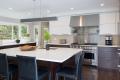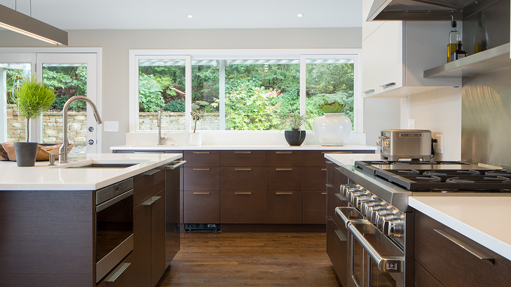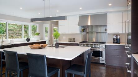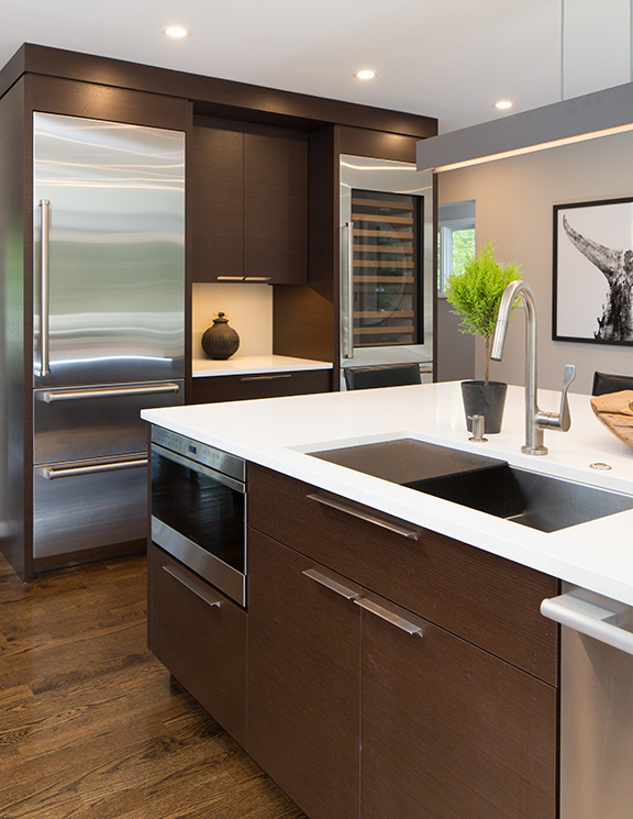 Gegg Design & Cabinetry, along with Becca Design, brought a 1980s remodel into modern times. The white laminate cabinets were replaced with naturally-finished, horizontal-grain-3matched, engineered quarter-sawn Wenge and painted wall cabinets on the range wall. Tile flooring was removed and oak floors throughout the house were extended into the kitchen. Layout-wise, the old kitchen had a cooktop located in a position that was very visible from the living space, and two doorways cut off the view from the kitchen into the same space. To address the layout challenges, the designer opened the two doorways as much as possible. The 48” range was situated in the center of the kitchen across from the island. A 30” refrigerator/freezer and 30” wine and refrigerator drawers split up the refrigeration needs. The new island is simple and clean with seating on three sides for interaction and views out into the green space that surrounds the home and includes a sink, dishwasher and microwave drawer. A custom stainless-steel hood was designed with clean lines and crisp edges. The custom backsplash and stainless shelf align with the hood for a seamless look. The clean and simple look of the new kitchen improved interaction with the surrounding outdoors and opened the lines of site into the rest of the home and living space without making the functional portions of the kitchen visible to the living areas. Goal accomplished.
