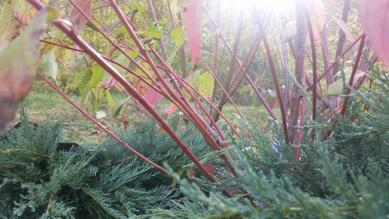 one: “Cornus 'Ivory Halo' or Tatarian Dogwood is a medium-sized shrub for every season but puts on a stunning finale in the winter months. It has beautiful variegated leaves and white blooms in the spring and summer, berries in the fall and brilliant red stems to brighten the winter landscape. The cut red stems are perfect for holiday decorating.” Sarah Riley, Bowood Farms.