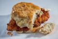 Chicken Biscuit: Thanks to a higher fat content, a marinated chicken thigh stands up perfectly to smoking and frying in this satisfying ‘wich. The kick of Nashville hot sauce and a sweet swirl of honey butter on the biscuit play together harmoniously. Plus, there’s a juicy secret to this dish that puts it over the top.