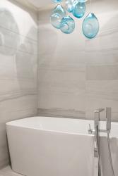 Speaking of glass, check out those backsplashes in the master bathroom and kitchen. “That’s a flat piece of glass,” Gilula says, explaining that Lamb uses a special technique to superimpose pictures onto the surface of glass, giving the material a three-dimensional appearance. “He did the same thing on the shower wall,” says Gilula, referencing the sheet dividing the shower and commode.
