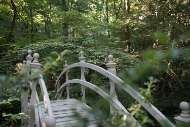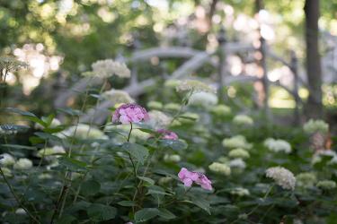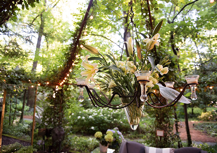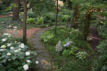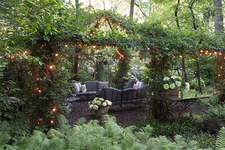 Another important part of the plan involved a place within the garden to entertain family and friends that would blend seamlessly with the woodsy surroundings. Designed by the homeowner herself, the now-vine-covered superstructure, constructed of copper piping, encompasses a relaxed seating area and a separate space for dining. While the enchanted pavilion seems to naturally spring from the forest floor and the living canopy above, finding the appropriate vines to create such an ambiance was not easy. “Just name any vine you’ve ever heard of and is on the market and we’ve tried it,” the gardener says laughing, noting that the preponderance of shade at the site of the pavilion made things more difficult. Her husband refers to the process as the “vine wars” in which the couple planted every vine they could find and “at the end you see who makes it” in a survival of the fittest process. Winners include Dutchman’s pipe, akebia, pink honeysuckle, sweet autumn clematis, trumpet vine, climbing hydrangea, euonymus and Boston ivy. While the vine blossoms are not prolific due to the shade, they do provide a succession of flowers throughout the growing season.
