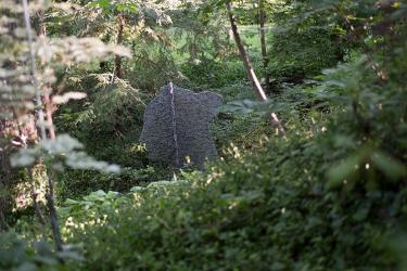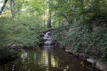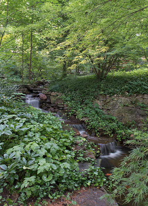 Coming up with the right plant material for the steep, shady setting also has required a bit of trial and error. Initially, the couple planned for azaleas to cascade down the hillside and surround the pond. The azaleas promptly died. They then tried rich, glossy-leaved laurel. The laurel wasn’t happy either.