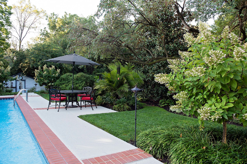 The brick-floored outdoor eating area just off the home’s living and dining rooms provides a vista into the carefully symmetrical European courtyard garden, yet is somewhat screened from the garden surrounding the pool.