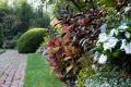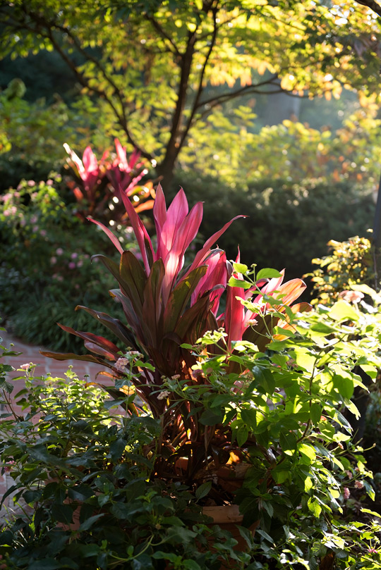 Along the pathways flanking the courtyard lawn, a veritable botanical garden of colors and textures provides delight to the eye. Hostas and multi-colored coleus blend with tropical elephant ears and containers of grasses and impatiens. The homeowner has made liberal use of containers to add variety and height to the garden and well as keeping plants safe from marauding rabbits.