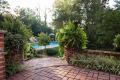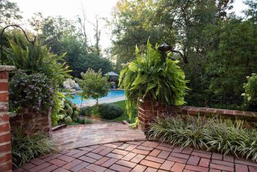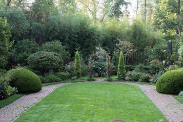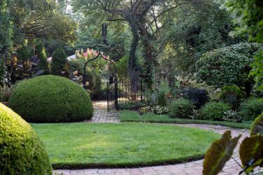In the courtyard huge, mounding boxwoods seem to bubble over the brick pathways lining both sides of a grassy lawn. A wrought-iron arbor planted with climbing pink honeysuckle and clematis provides a focal point at the end of the lawn and offers a peak into a secluded sitting area beyond. Pyramidal arborvitaes just beyond the arbor seem to stand guard at the entrance to the private space. On the left side of the lawn, a wrought-iron gate beckons garden visitors to stroll down a shrub-lined brick walk. That path will eventually lead to the secluded swimming pool, which boasts its own private garden accented with a grassy lawn and mature flowering shrubs.