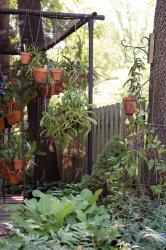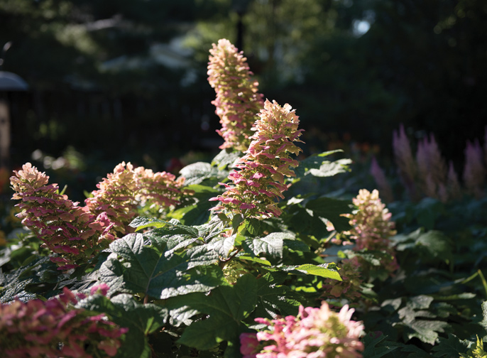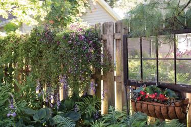 Some of Carol's current favorite plants include clematis 'Rooguchi' and clematis 'Princess Diana.' Both climbing vines have long bloom times that last from spring through fall. She interplants the two so the blue, bell-shaped flowers of 'Rooguchi' intertwine with the star-shaped pink blossoms of 'Princess Diana' to create a spectacular display. Another favorite, oakleaf hydrangea 'Ruby Slippers', provides a show of blossoms that initially flower white but turn ruby red as summer progresses.