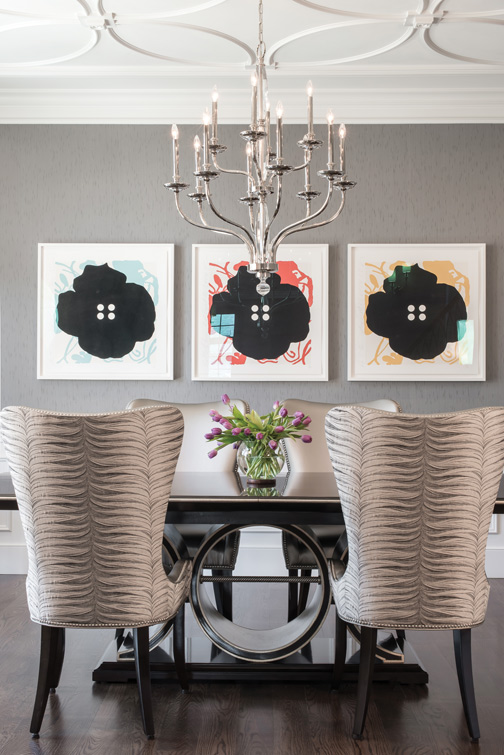 Off the foyer, the formal dining room is centered by a Marge Carson table with a dynamic circular base, silver edge and muted quadrefoil design in the surface. The Designmaster chairs are upholstered in a silvery fabric, complementing the table edge, and overhead, the ceiling is embellished with elegant curvilinear woodwork, designed by Tonella and fabricated by Jeff Berry of JB Construction.