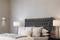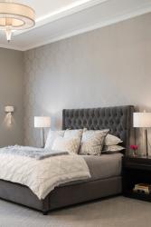 Dominated by soft grays and white, the décor is fresh, bright and sophisticated. Five-inch hickory plank flooring blankets the activity areas, and curved lines and subtle quatrefoil motifs are frequently repeated, creating a visual “rhythm” throughout the home. The theme is first apparent in the foyer, where Tonella custom-designed the curvilinear wrought-iron balusters lining the curved main staircase.