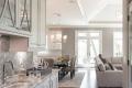 Much of the family’s time is spent in the open kitchen/casual dining/hearth room area, which was significantly expanded from the original floor plan. The owners had specified a “white kitchen, but not contemporary,” and Fox Creek Furniture and Woodworks responded with vast expanses of superbly crafted transitional white cabinetry. Mont Blanc quartzite surfaces, clear glass subway tiles with a hint of blue-gray and stainless Sub-Zero and Wolf appliances complete the effect, and a 12-foot contoured island, inset with a farmhouse sink, defines the kitchen from the dining area.